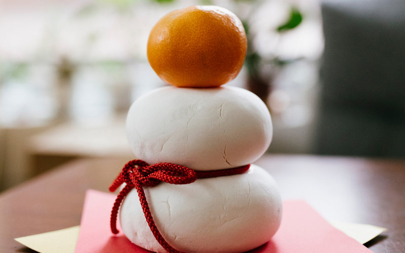 Outra tradição japonesa para a celebração do Ano Novo é o kagami mochi, feito com dois mochis japoneses. O menor é colocado em cima do maior e uma laranja-amarga fica no topo desse arranjo.