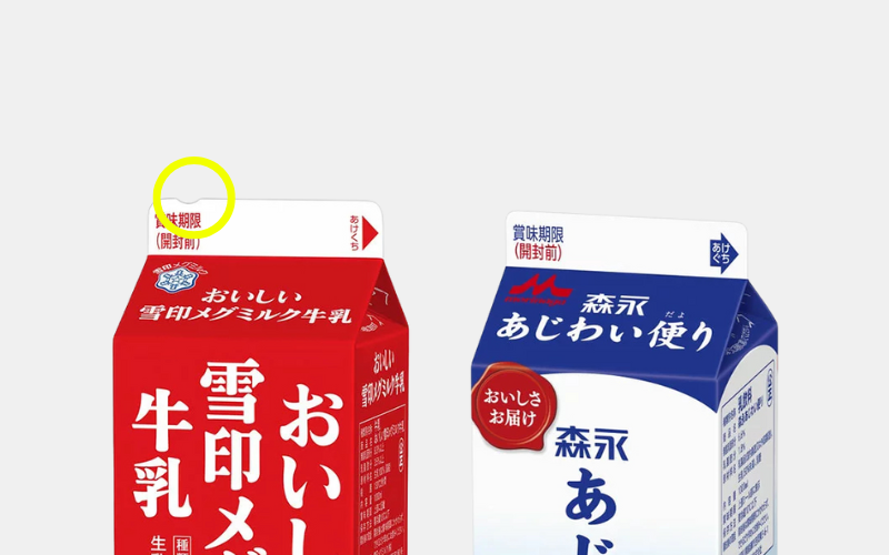 O leite integral costuma vir em embalagens com um pequeno entalhe (ou corte) na parte superior, geralmente no lado oposto à abertura. Isso ajuda a identificar o produto pelo toque. O kanji “牛乳” estará em destaque no rótulo, indicando que o conteúdo é 100% leite.