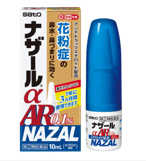 O spray nasal ナザールαAR0.1% (Nazal αAR 0,1%) é outro medicamento disponível em farmácias japonesas. Ele é indicado para aliviar sintomas de alergias sazonais, como espirros, nariz entupido e coriza causados pelo pólen, atuando diretamente nas narinas para reduzir a inflamação e o congestionamento.