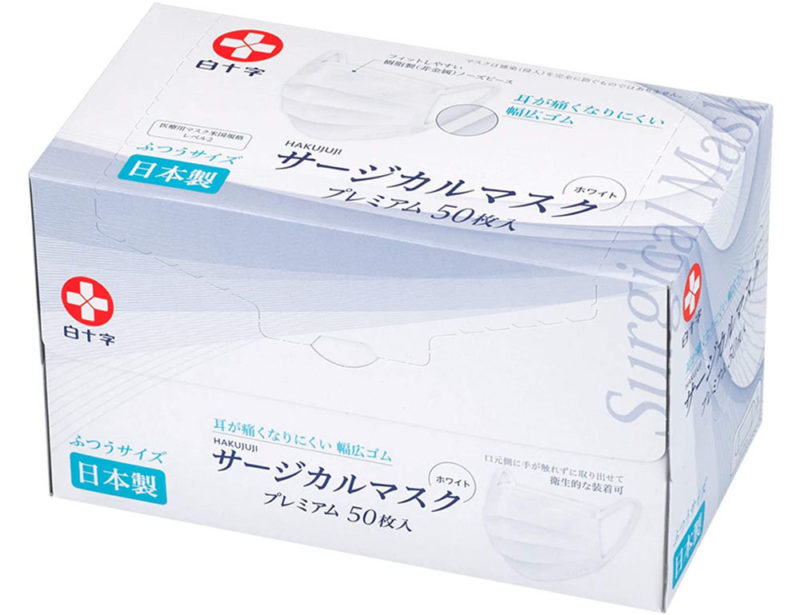 A máscara cirúrgica (médica) 白十字 (Hakujuji) é produzida por uma fabricante de longa tradição em produtos de higiene. Ela oferece filtragem de 99% de bactérias e partículas finas e está em conformidade com o padrão americano Nível 2 para máscaras médicas, que regula a impermeabilidade a sangue. A máscara está disponível em dois tamanhos: normal (17,5 x 9,5 cm) e pequeno (14,5 x 9,5 cm).