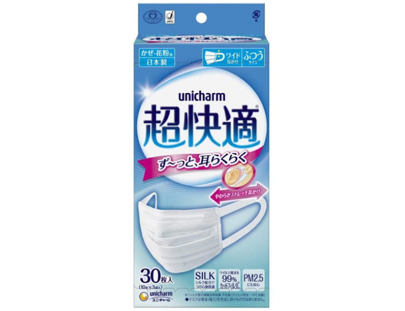 A “Máscara Superconfortável” da Uni Charm, uma das maiores fabricantes de itens de uso diário, é uma máscara descartável padrão e muito popular. Além de oferecer alto desempenho de filtragem de 99%, o filtro é misturado com seda, proporcionando uma sensação confortável ao usar. Os elásticos também são suaves e não machucam as orelhas, mesmo após longos períodos de uso. A máscara está disponível em dois tamanhos: normal e pequeno.