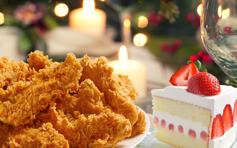 Os bolos são enfeitados com bonecos de Papai Noel, e em cores que lembram o Natal, e o frango frito é comprado nas lojas do KFC, aqui nesta matéria você entenderá melhor o motivo dos japoneses comerem KFC no Natal.