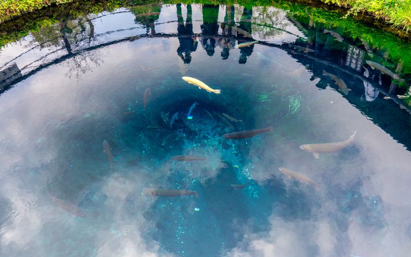 O nome Oshino Hakkai significa “os oito mares de Oshino”. Há séculos, essa área fazia parte de um antigo lago que secou, dando origem a oito nascentes. A água vem do degelo do Monte Fuji, filtrada por rochas vulcânicas, o que a torna incrivelmente pura e transparente, você consegue ver o fundo e até os peixes nadando lentamente.